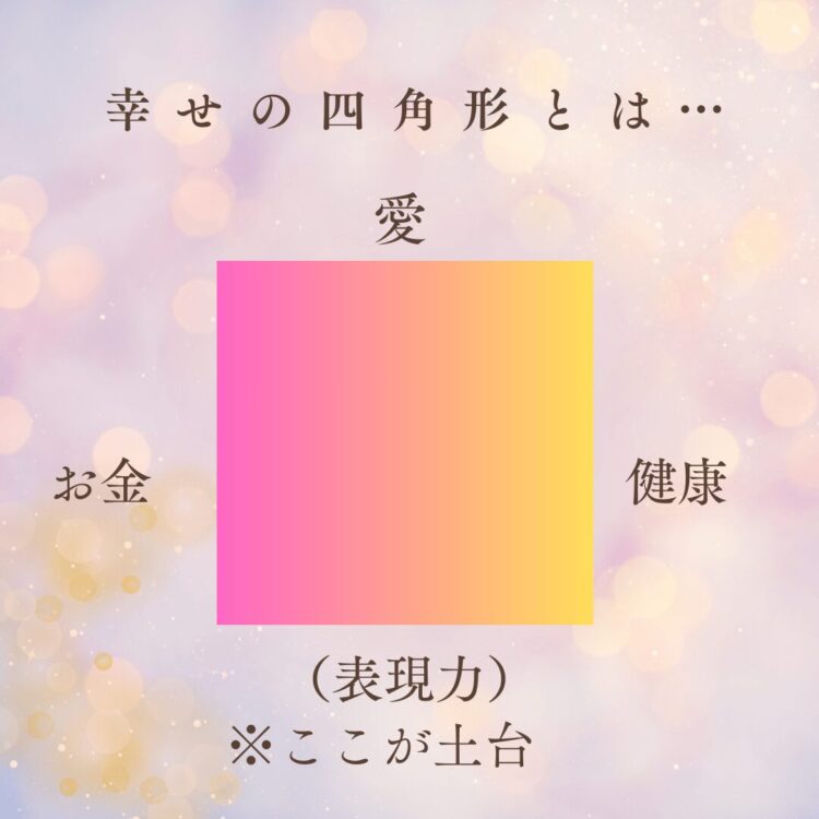 当社は直営エステサロン「THE FAITH」を11店舗経営しており、そこに通うお客様は、外面だけでなく、内面、精神面も磨いて健康的に美しくなり、人生を彩り溢れるものにしていくために、前向きな心を作るためのワンポイントアドバイス等もさせていただいており、その中の一つに「幸せの四角形」というお話があります。